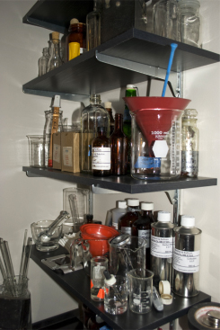 The first memory is of Edison’s laboratory. The room was full of bottles, beakers, flasks, test tubes and graduated cylinders of all sizes and shapes. As I write this, I’m wondering if this memory isn’t responsible for all of my wet plate collodion cabinets, work benches, and shelves looking like this: