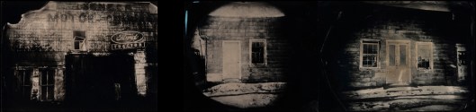 Here are three of my collodion plates presented as a triptych. I combined 18th and 19th century processes, in that the original images were medium format transparencies made with a Holga “toy” camera. Each transparency was then projected from a darkroom enlarger onto a prepared collodion plate. The back of each finished plate was painted black and glued to a sheet of black glass, then framed as a single piece.