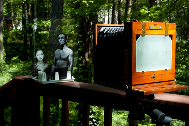 I searched magazines for images that would work together, then cut them out. I taped each cutout to a separate piece of glass and placed the glass in a rack to hold them vertical. One is closer to the camera for depth of field and selective focus (I focused on her). I used natural outdoor lighting for the collodion exposure.