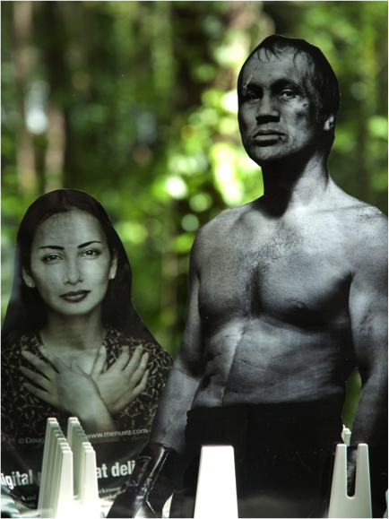 This is a digital image of one of the test arrangements. You can see the printed magazine text on the back of “Anna”. The rack holding the plates of glass was kept just out of the image. In this one, Anna’s behind the boxer. I switched their positions for the final version, since he played a minor role in the story.
