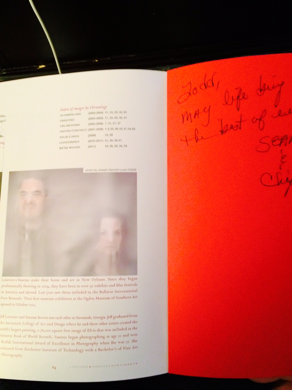 “I’m Sean, the owner of the dead bird in this image by Jeff and Vanessa. Chip is the name of my dead bird. I love him so. He would have been so proud to sign your book, so that’s why I signed on his behalf. We thank you again for asking.”