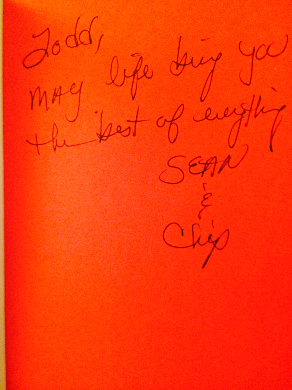 “’Todd, May life bring you the best of everything!'” (dramatic pause) “Signed, ‘Sean and Chip.’”